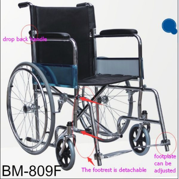 Wheelchair with drop-back handles. More compact for storage. Steel frame. Fixed arm/footrest. Seat width: 46cm. Weight capacity: 100kg.